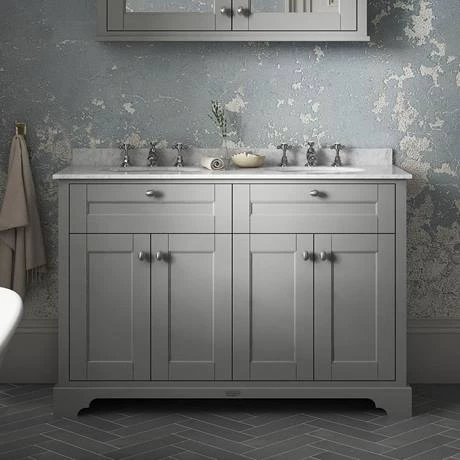 Add a cool touch of colour to your bathroom with this Storm Grey 1200mm unit. It features soft close doors which limits the daily wear and tear and provides a quieter closing action. The luxury Grey polished double marble top basin achieves a timeless, classic look. Ideal for creating a period look in your bathroom this furniture range with it’s clean classical design blends beautifully with Old London’s range of traditional bathroom furniture.